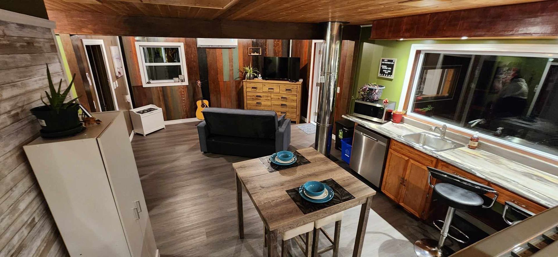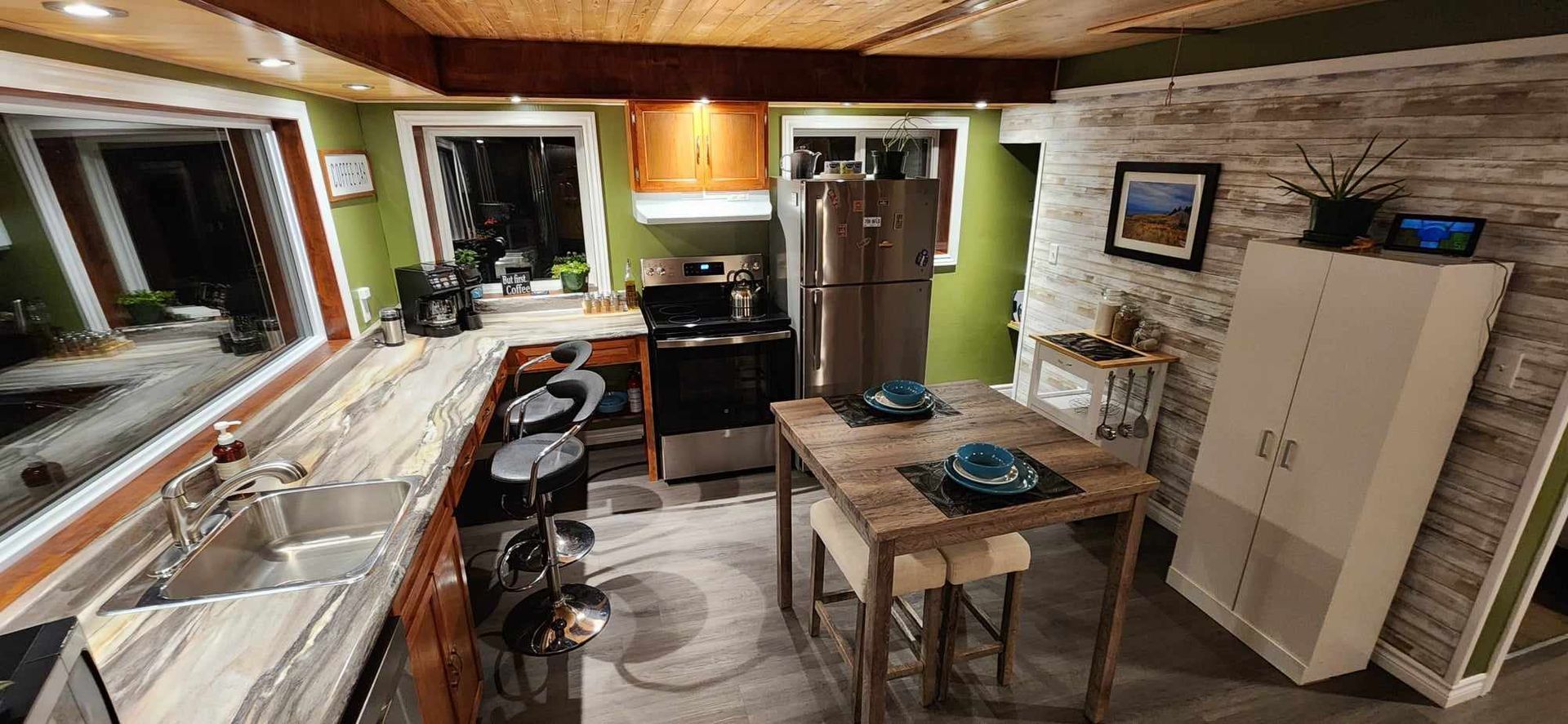 We have a 1 bedroom suite with a double bed on the main floor. Open concept, kitchen and living room area. Which includes bay windows for a perfect view of the ocean as you enjoy your complimentary coffee.